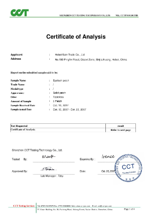 by qian006@zen-ocean.com September 25, 2025 Testing Report Client : Hebei Sain Trade Co.,LtdProduct name:Eyelash patchReport Date: 2017-12-19Report No. CCT17121901HRM