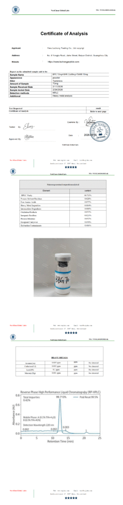 by qian006@zen-ocean.com April 9, 2026 Testing Report Client: Yiwu Lezhong Trading Co. Product Name:BPC +GHK-Cu+Tb500 Report Date:03/15/2026 Report Number:NO.: VCGL260201182GAL