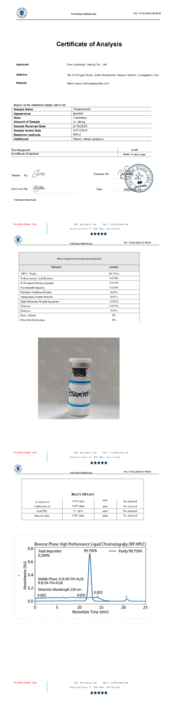 by qian006@zen-ocean.com April 10, 2026 Testing Report Client: Yiwu Lezhong Trading Co., Ltd.Product Name:TesamorelinReport Date: 03/15/2026Report Number:VCGL260211017DCB